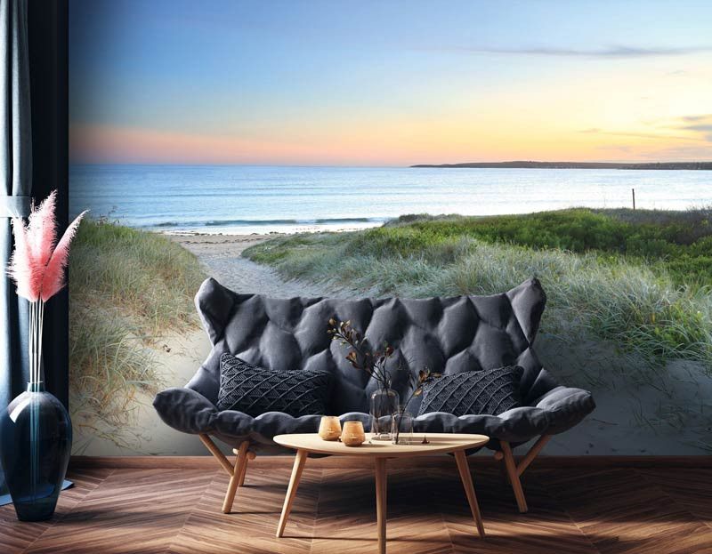 Breng de serene sfeer van het strand naar je huis met dit prachtige fotobehang van een strandpad door de duinen naar zee. Het strandpad door de duinen leidt je naar een oase van rust en ontspanning, waardoor je elke dag weer tot rust komt. Dit behang is perfect voor wie op zoek is naar een rustige, ontspannen sfeer in huis.