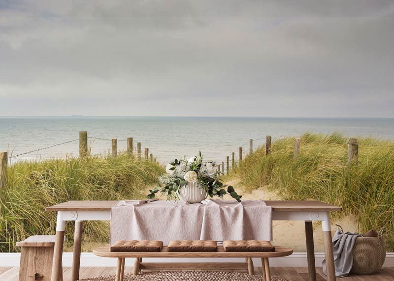 Haal de rust en schoonheid van de kust in huis met het fotobehang Duinen bij de Noordzee. De zachte zandduinen, wuivende helmgras en het uitzicht op de horizon brengen een ontspannen sfeer en laten je wegdromen naar een zomerse strandwandeling. De natuurlijke kleuren van zand, lucht en zee zijn perfect in balans en creëren een harmonieuze uitstraling.