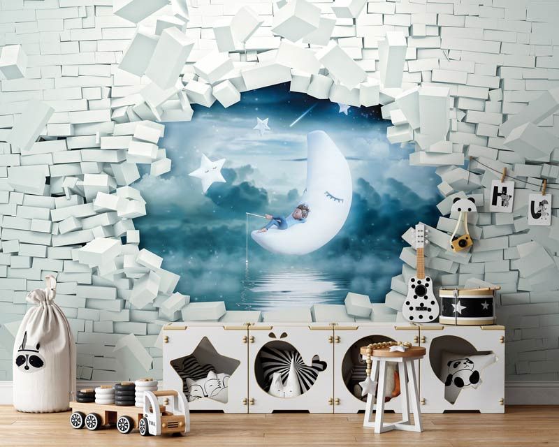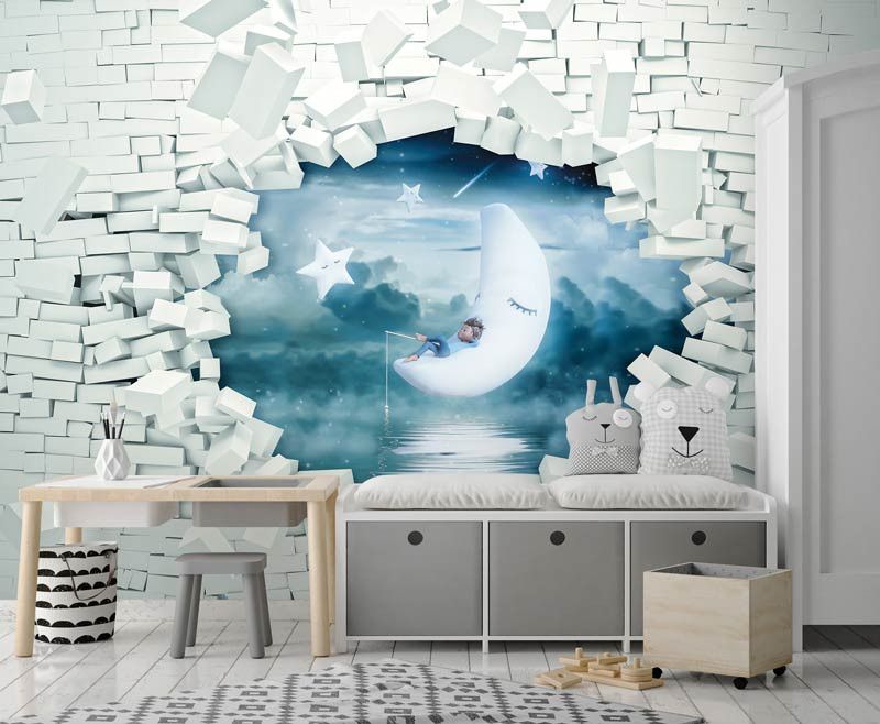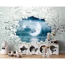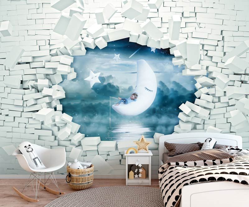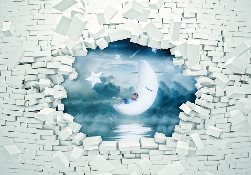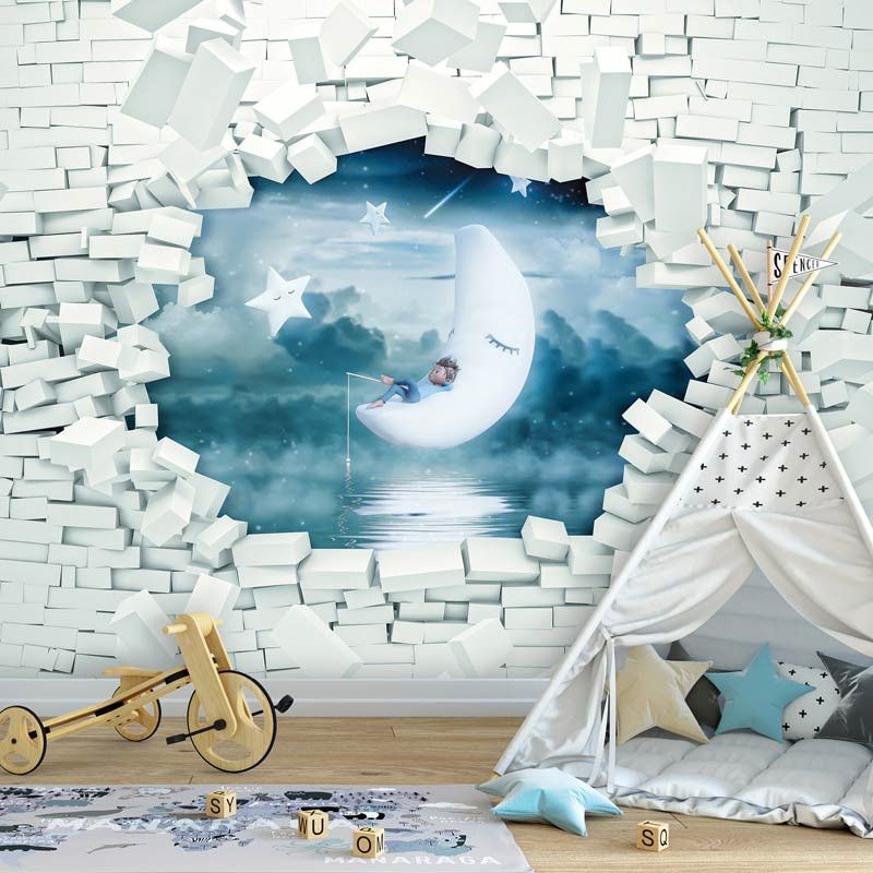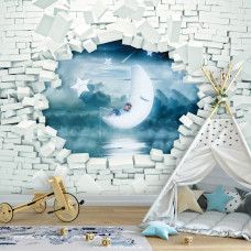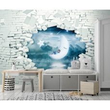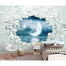 Met het fotobehang van deze gebroken muur, met op de achtergrond de maan en de sterren, is ieder kind zo in dromenland.