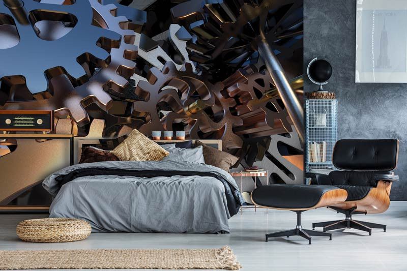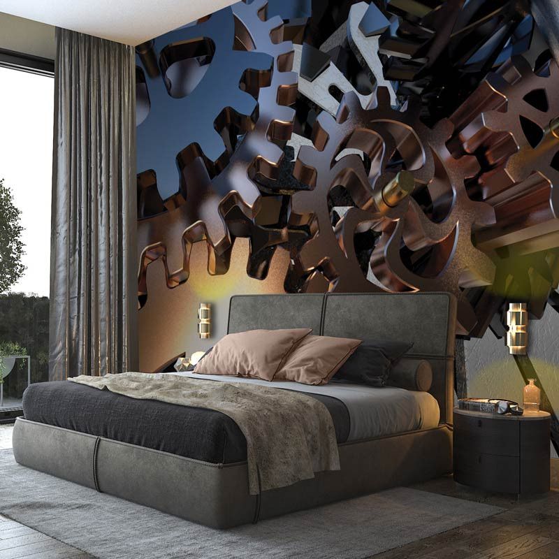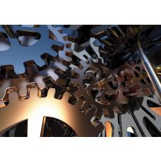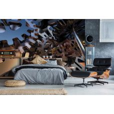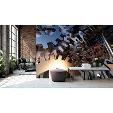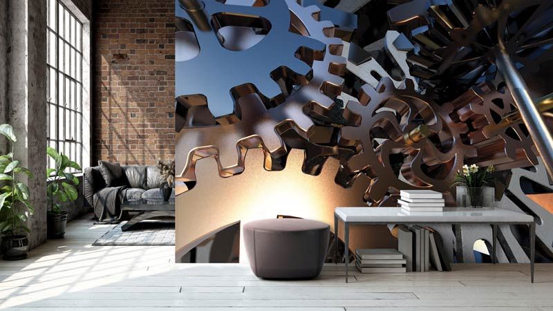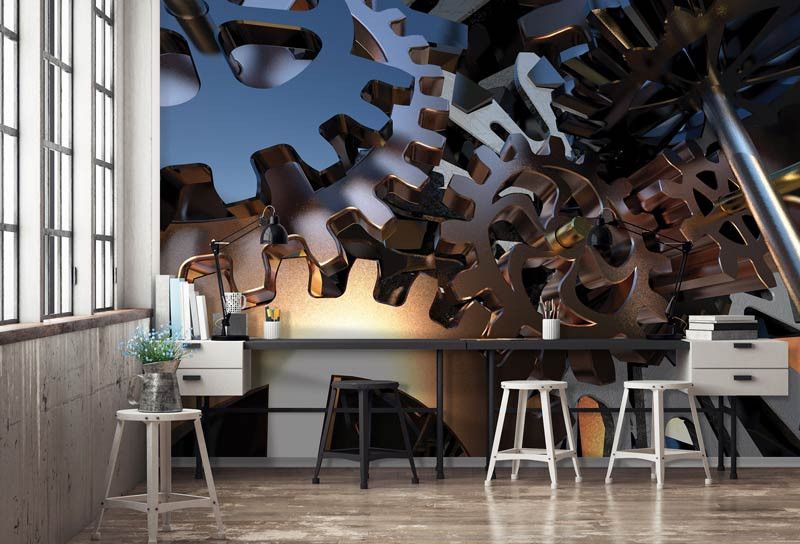Dit industriële 3D-fotobehang van tandwielen geeft een mechanisch en robuust gevoel aan elke ruimte. Perfect voor een moderne of industriële stijl in de woonkamer, kantoor of studeerkamer.