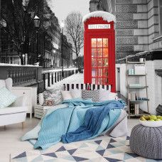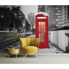 Vlies fotobehang van de bekende rode telefooncel in Londen, weergegeven op een zwart-witte achtergrond.