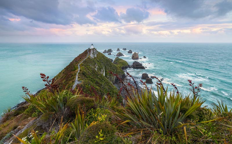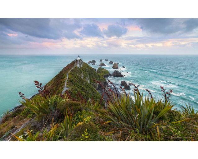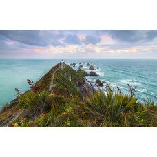 Het water van de zee zwerft wild door de kleine steile rotsen, die af en toe voor de kust oprijzen.
