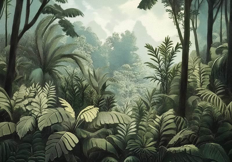Ga op ontdekking in een weelderige jungle met dit fotobehang van een tropisch oerwoud. Dichte begroeiing, grote bladeren en diepe groentinten creëren een intense, exotische sfeer vol avontuur en natuurkracht.