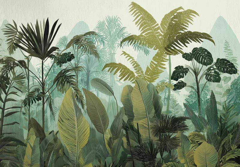 Met dit fotobehang haal je de tropen naar binnen: grote palmen, weelderige bladeren en zachte bergcontouren die samen een levendig en natuurlijk geheel vormen. De groentinten lopen vloeiend in elkaar over, waardoor een bijna schilderachtig effect ontstaat dat rust én energie brengt.