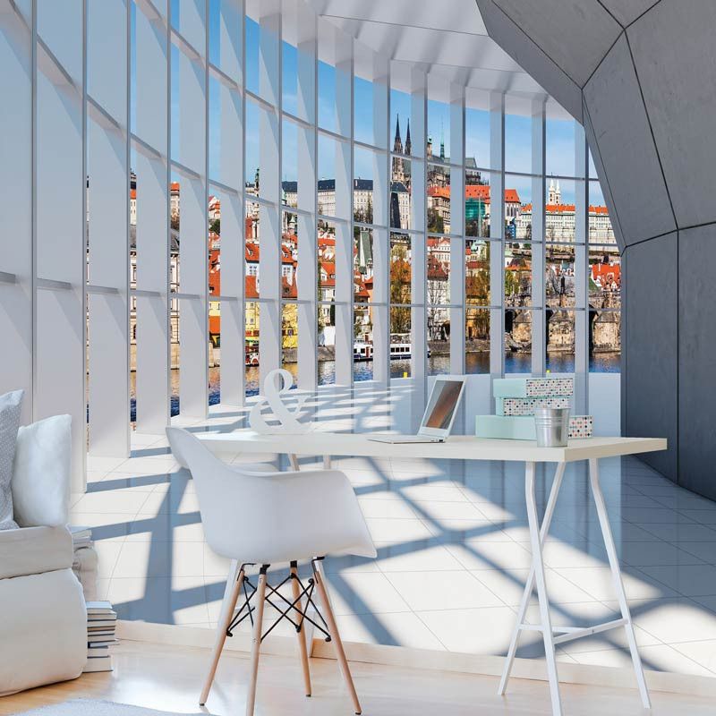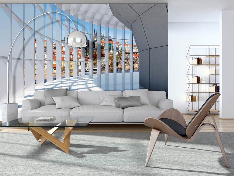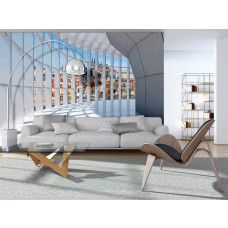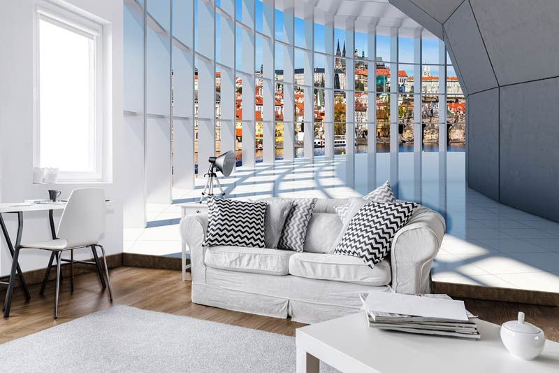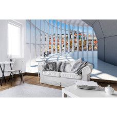 Vlies fotobehang van een 3D tunnel met uitzicht op een prachtige stad.