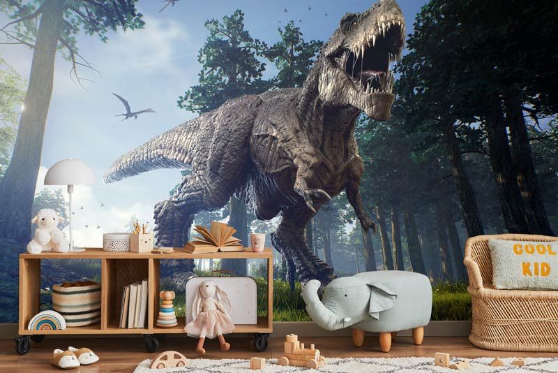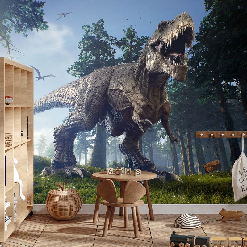 Geef de kinderkamer een stoere uitstraling met ons Fotobehang Tyrannosaurus Rex Dinosaurus. Laat de machtige T-Rex de fantasie van je kinderen tot leven brengen en transformeer hun kamer tot een prehistorisch wonderland.