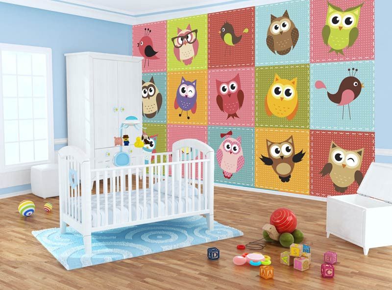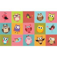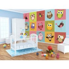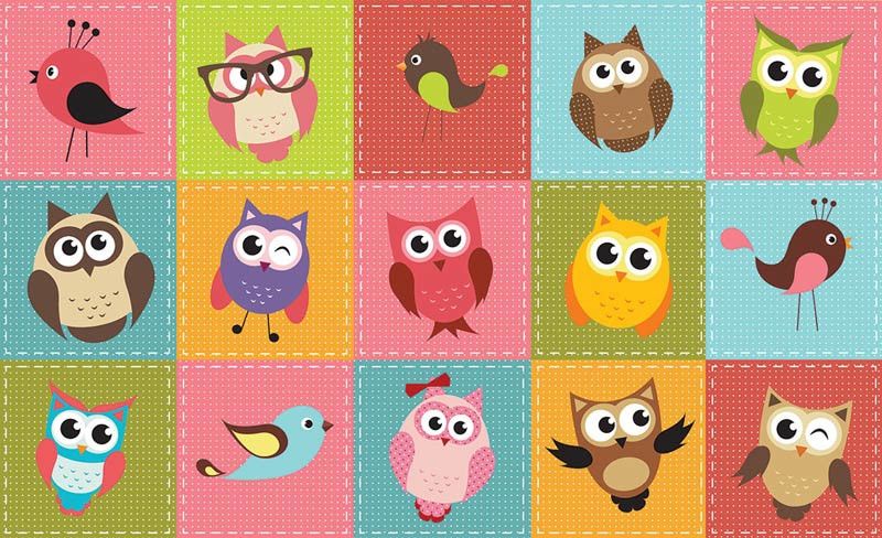 Vlies fotobehang van verschillende uiltjes en vogeltjes, weergegeven in gekleurde vierkanten.