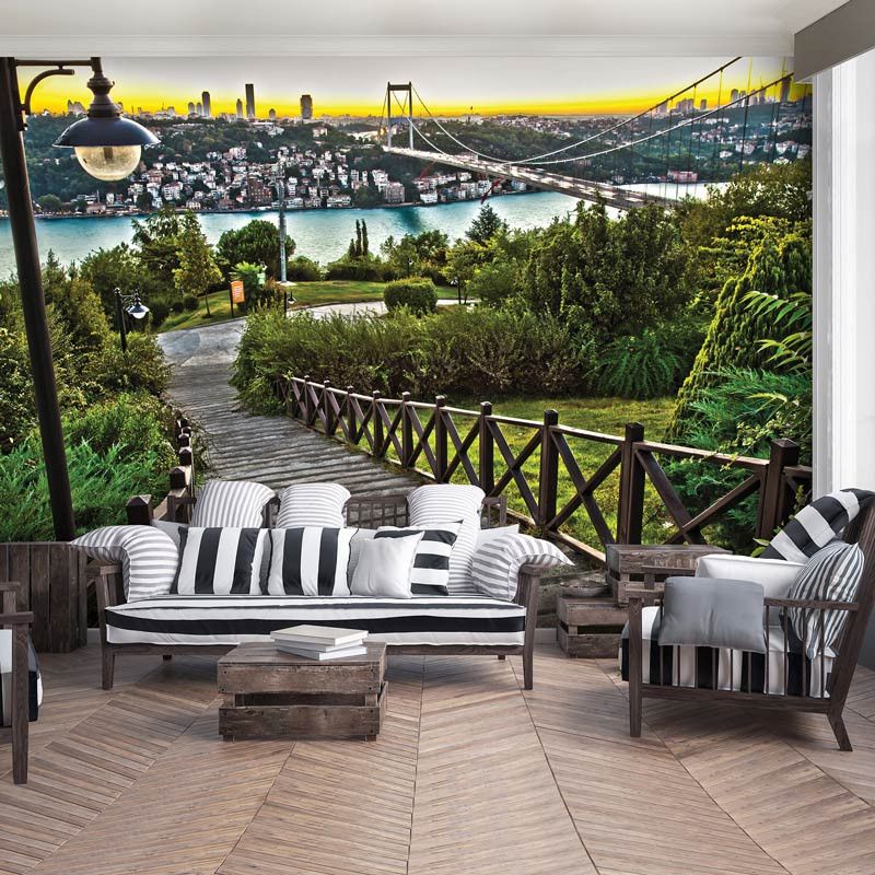 Vlies fotobehang met het uitzicht op de natuur en de drukke stad.