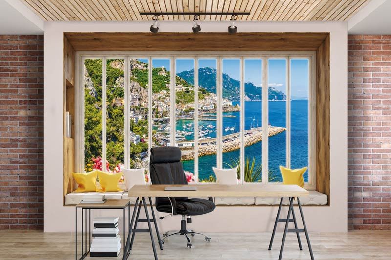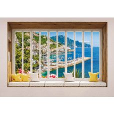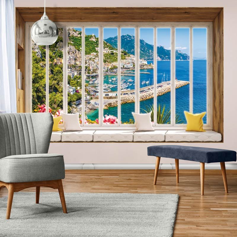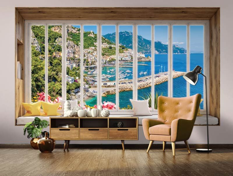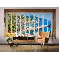 3D vliesbehang van het uitzicht op de stad in de bergen aan zee, gezien door het raam.