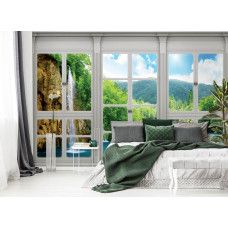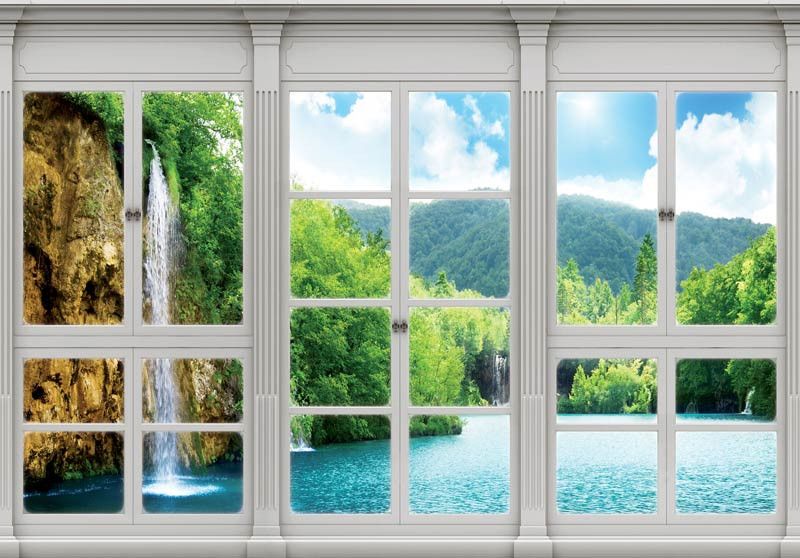 3D vliesbehang van het uitzicht op een prachtige waterval met daaromheen een fantastisch landschap, gezien vanuit het raam.