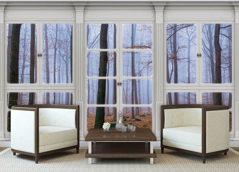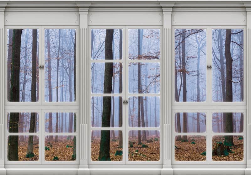 3D vliesbehang van het uitzicht op het herfstachtige bos, gezien vanuit het raam.