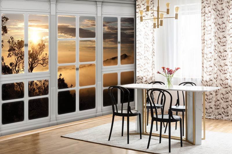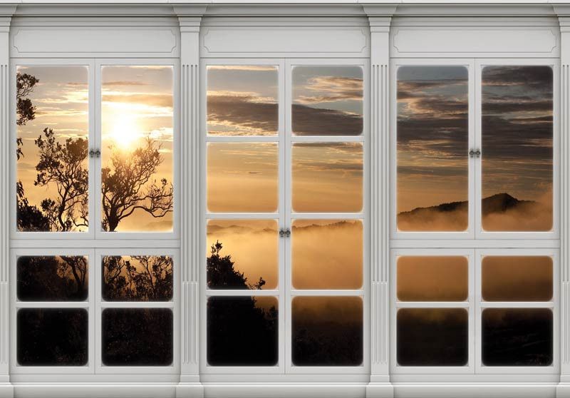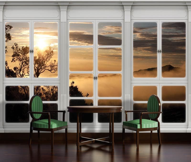 3D vliesbehang van het uitzicht op het bos in de dichte mist, gezien vanuit het raam.