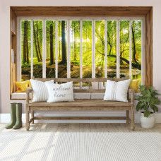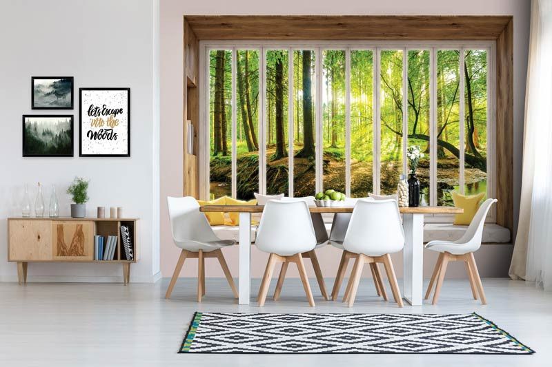 Fotobehang Uitzicht door het Raam op het Zonnige Bos 3D Perspectief
