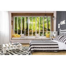 3D vliesbehang van het tropische uitzicht op het zonnige bos, gezien vanuit het raam.