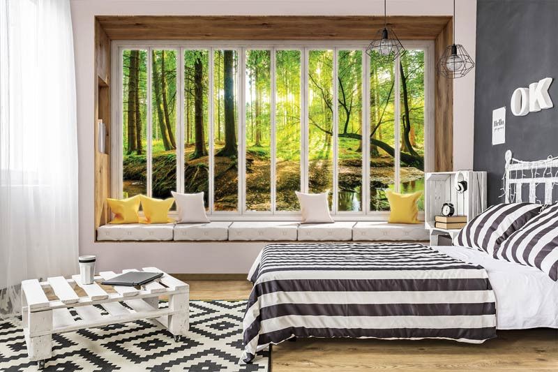 Fotobehang uitzicht door het raam op het zonnige bos 3D perspectief.
