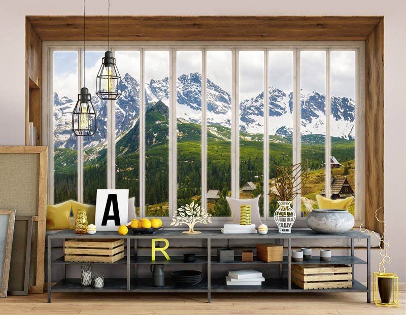 3D vliesbehang van het uitzicht op een prachtig berglandschap, gezien door het raam.