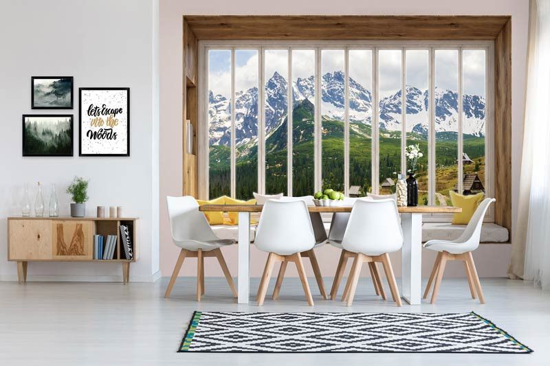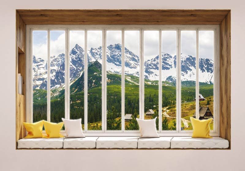 Fotobehang Uitzicht op de Bergen vanuit het Raam 3D