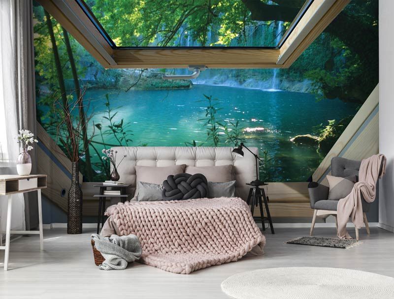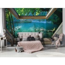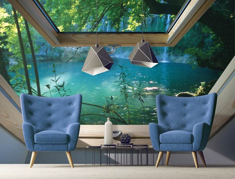 Vlies fotobehang van het uitzicht vanuit het dakraam op een helderblauw meer in de jungle, weergeven in 3D.