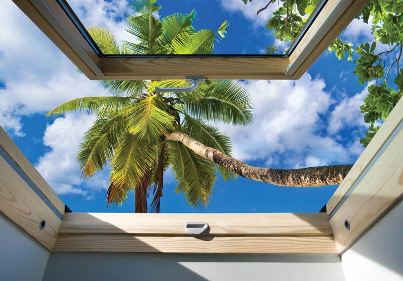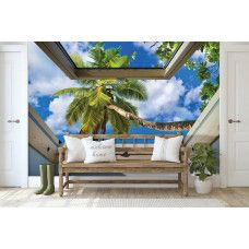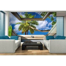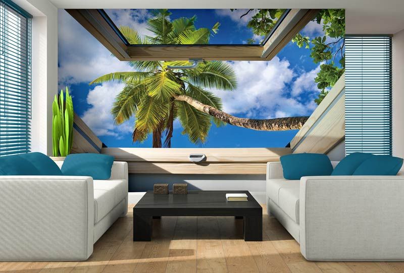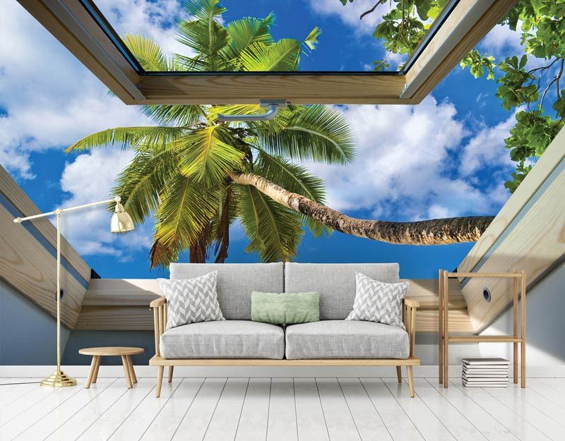 Vlies fotobehang van het uitzicht vanuit het dakraam op een prachtige palmboom, weergeven in 3D.