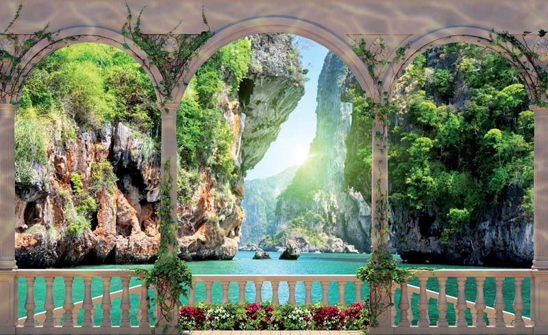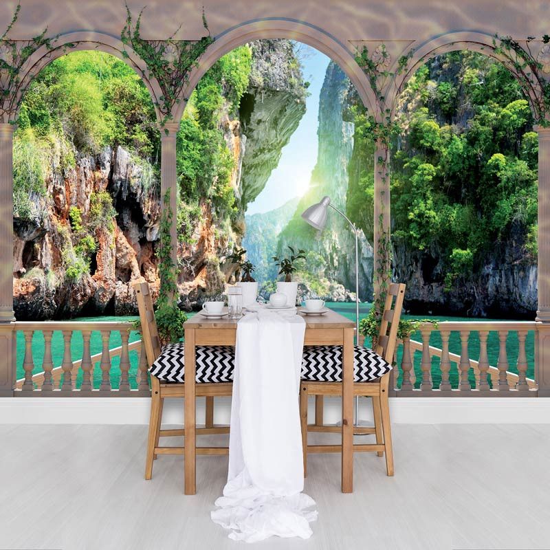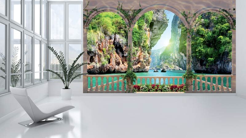 Vlies fotobehang van het hemelse uitzicht op het helderblauwe water en de rotsen vanaf het terras, weergegeven in 3D.