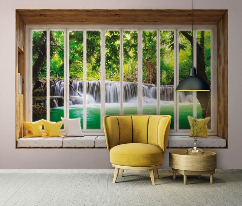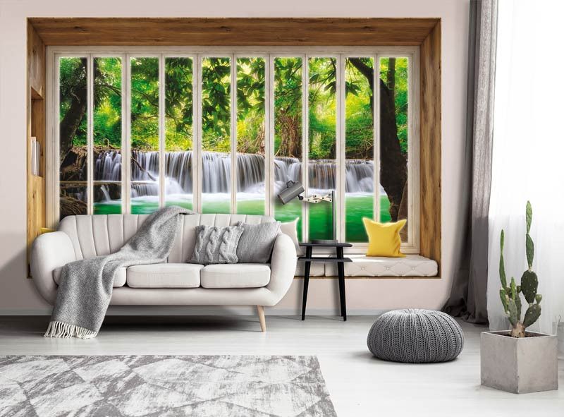 3D vliesbehang van het uitzicht op een prachtige waterval, gezien door het raam.