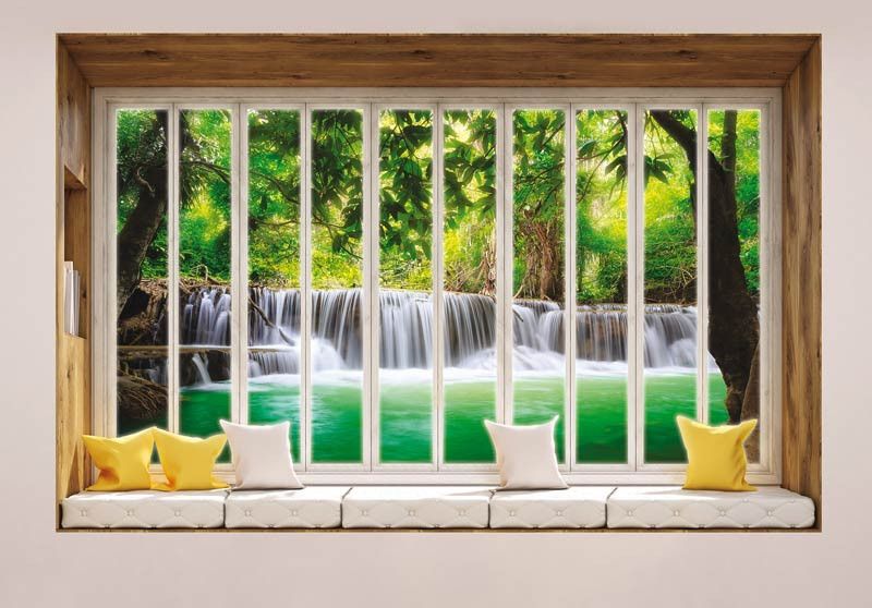 Fotobehang Uitzicht op de Waterval door het Raam 3D Perspectief