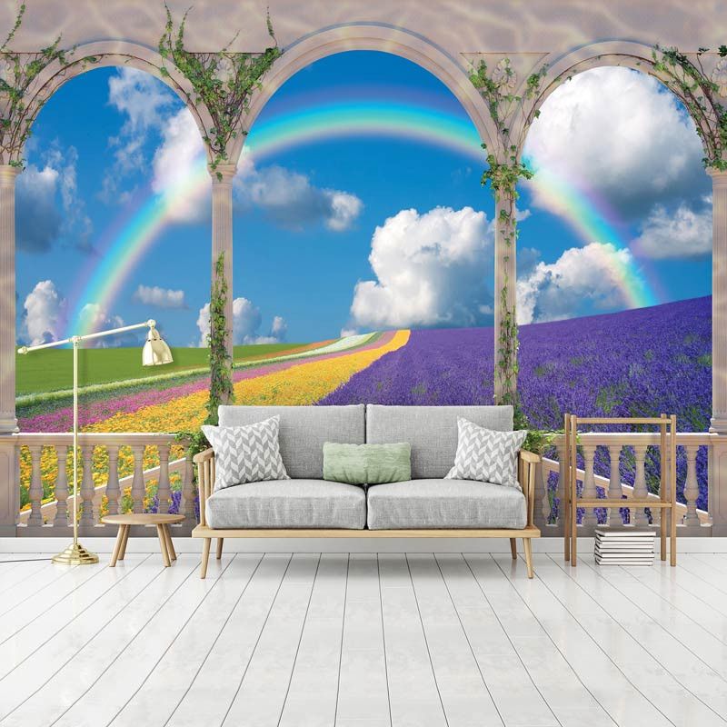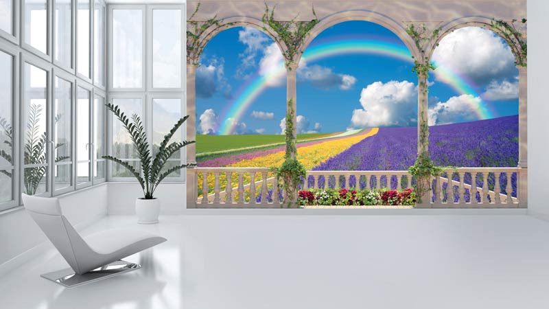 3D Vlies fotobehang van het prachtige uitzicht op het gekleurde bloemenveld, gezien vanaf het terras.