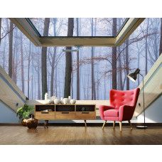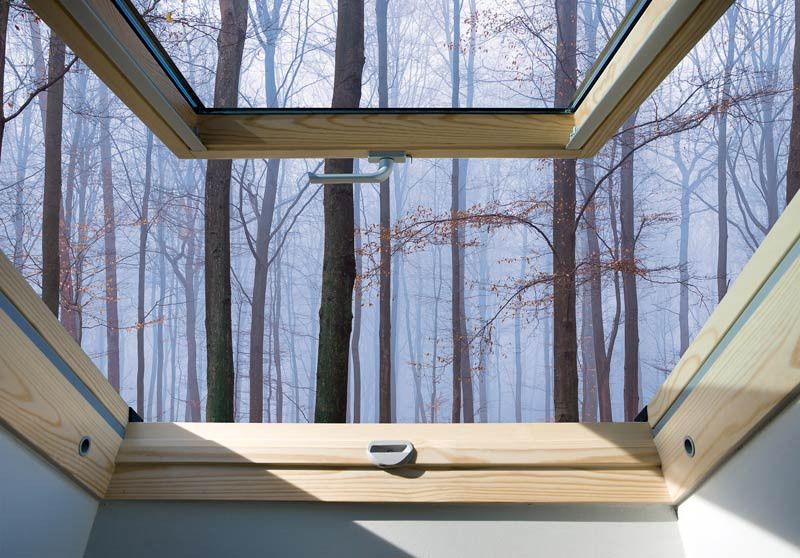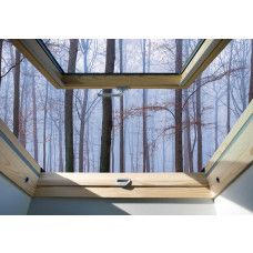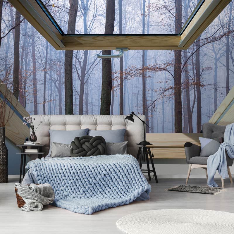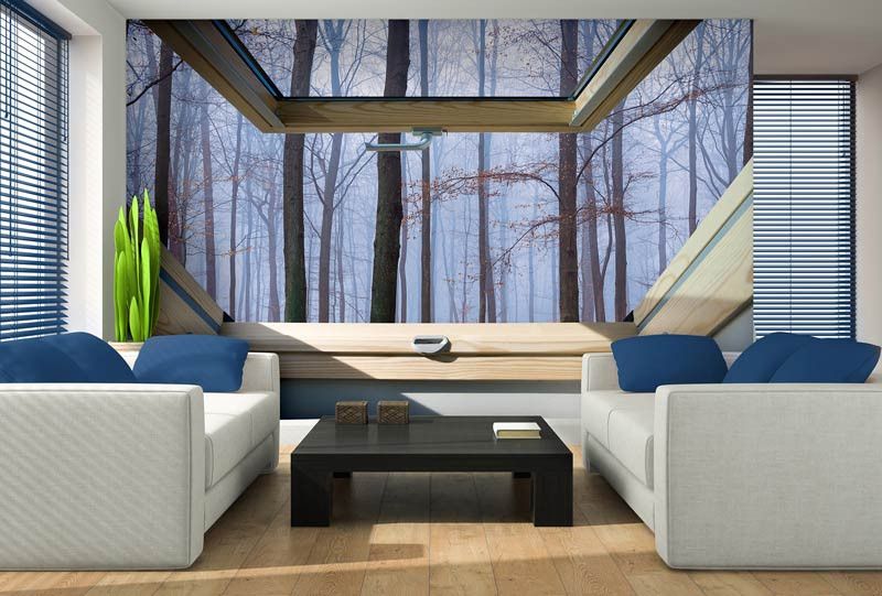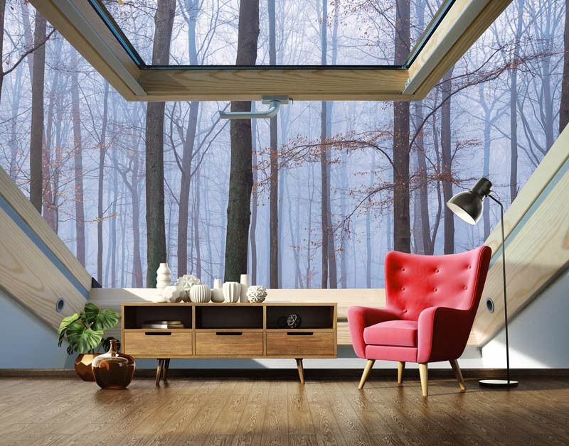 Vlies fotobehang van het uitzicht, vanuit het dakraam op het bos, weergeven in 3D.