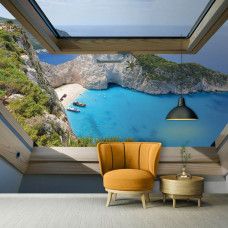 Vlies fotobehang van het uitzicht vanuit het raam op het bekende scheepswrak op het Griekse eiland in Zakynthos, weergeven in 3D.