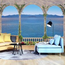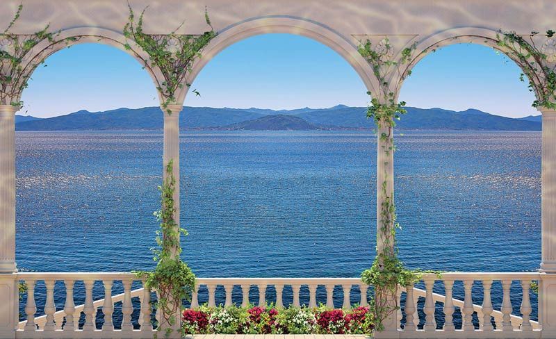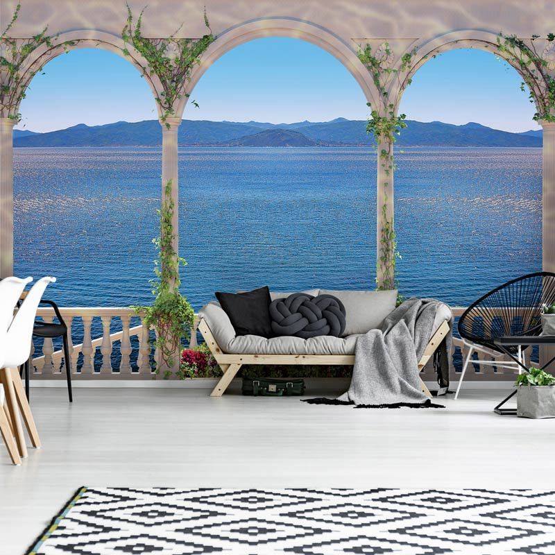 Vanaf het Griekse balkon kijk je uit over de rustige zee met op de achtergrond in indrukwekkend berglandschap.
