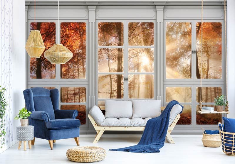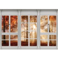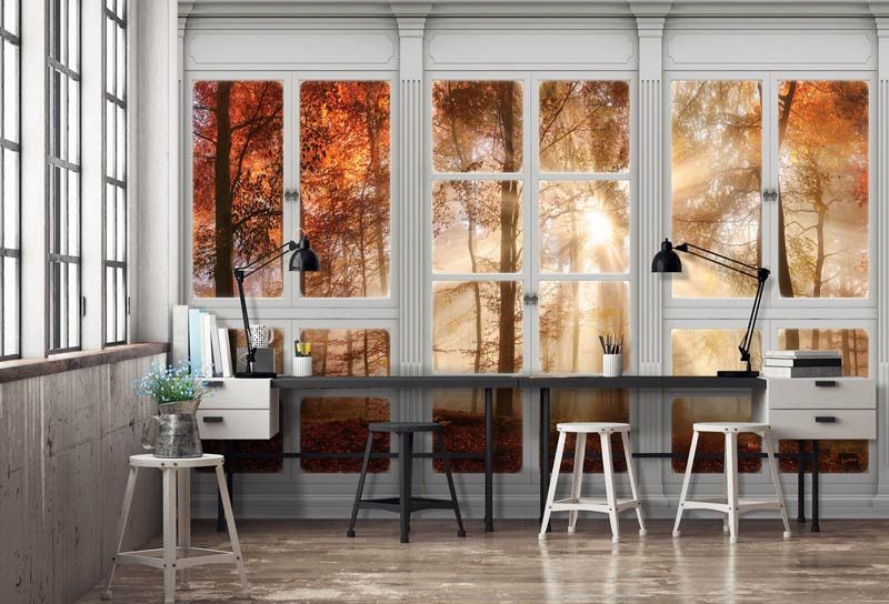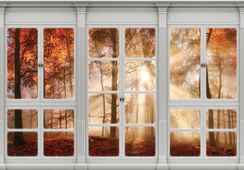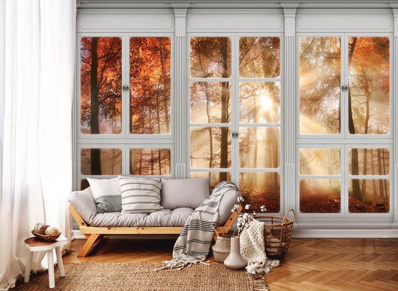 Vliesbehang van het uitzicht op het prachtige, herfstachtig bos, gezien vanuit het raam. Dit zorgt voor een fantastisch 3D-effect!
