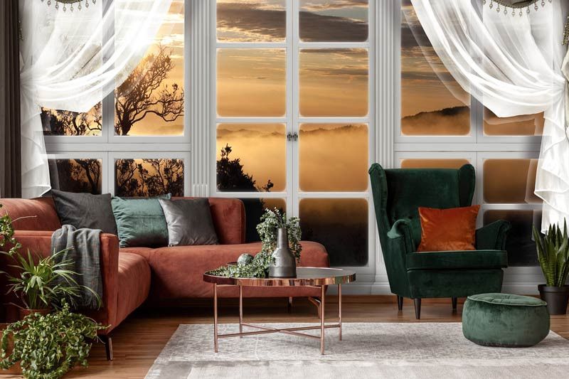 Fotobehang Uitzicht vanuit het Raam op het Mistige Bos 3D