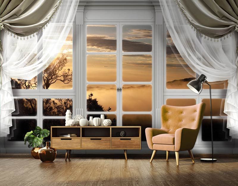 3D vliesbehang van het uitzicht op het bos in de dichte mist, gezien vanuit het raam.