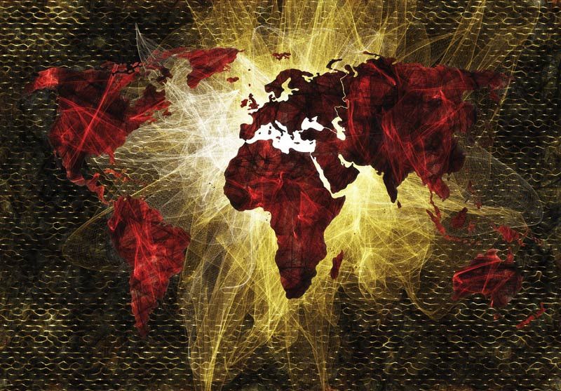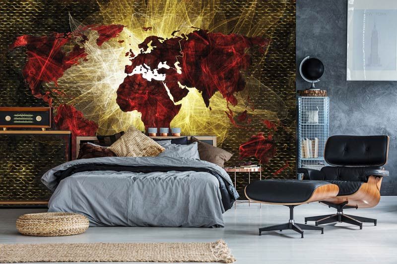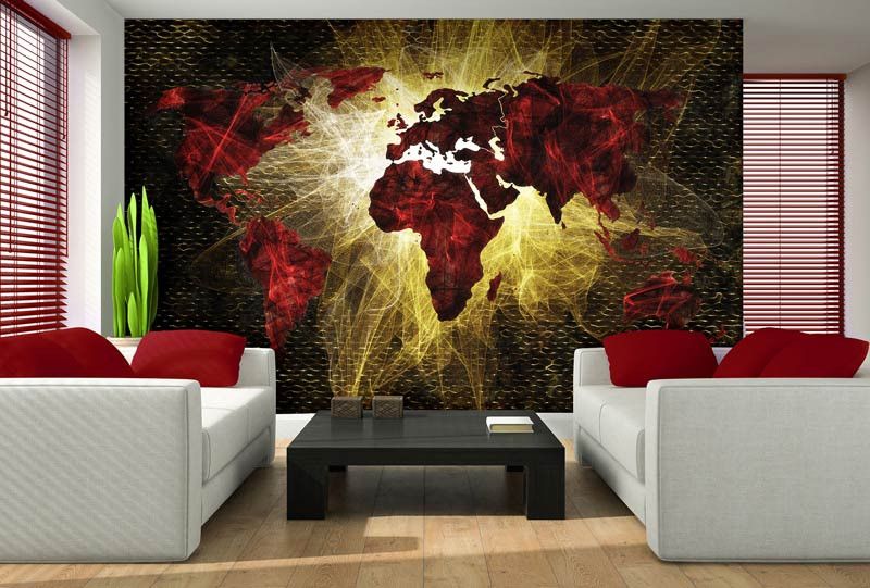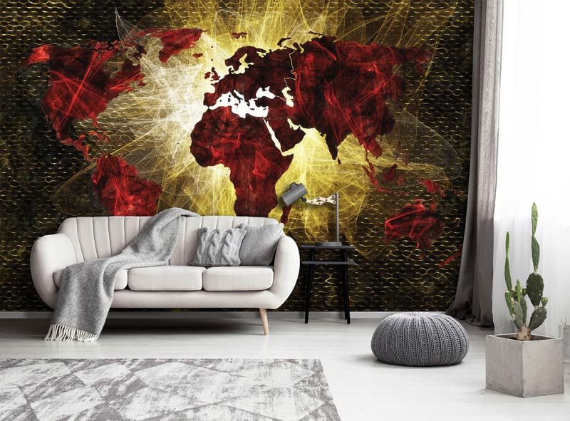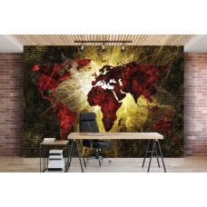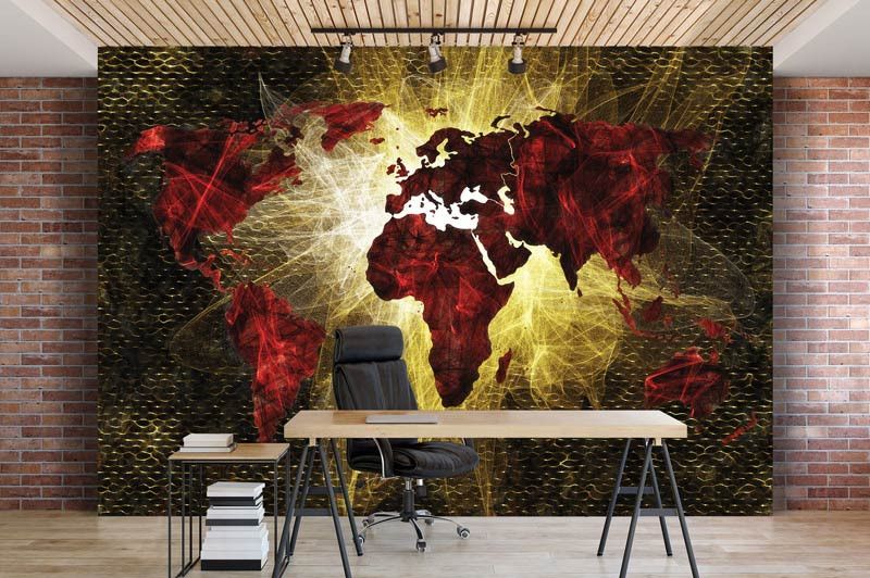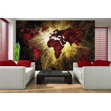 Vlies fotobehang van een abstracte, rode, verlichte kaart van de wereld.