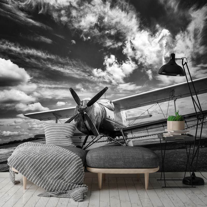Fotobehang met daarop een prachtig vliegtuig weergegeven in het zwart-wit.