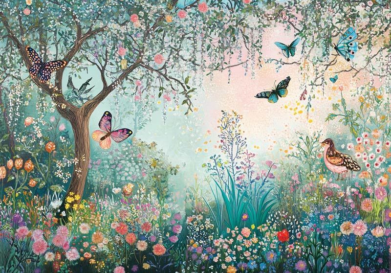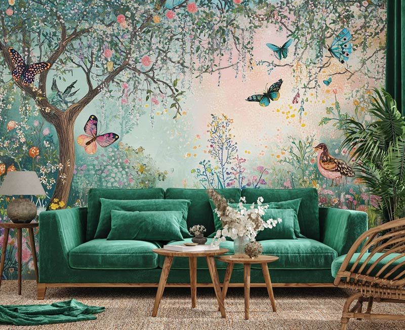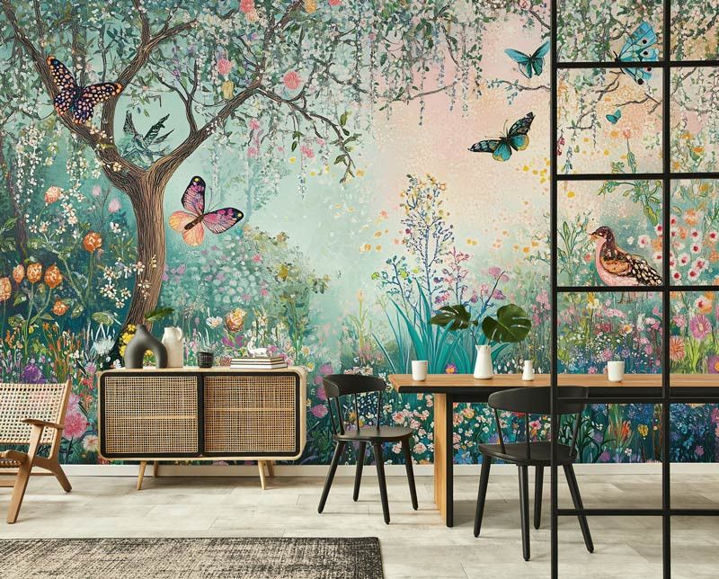 Dit fotobehang past prachtig in een kinderkamer, speelhoek of een romantische slaapkamer, waar natuur en kunst samenkomen tot een harmonieus geheel.