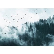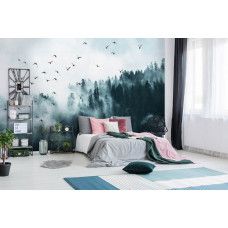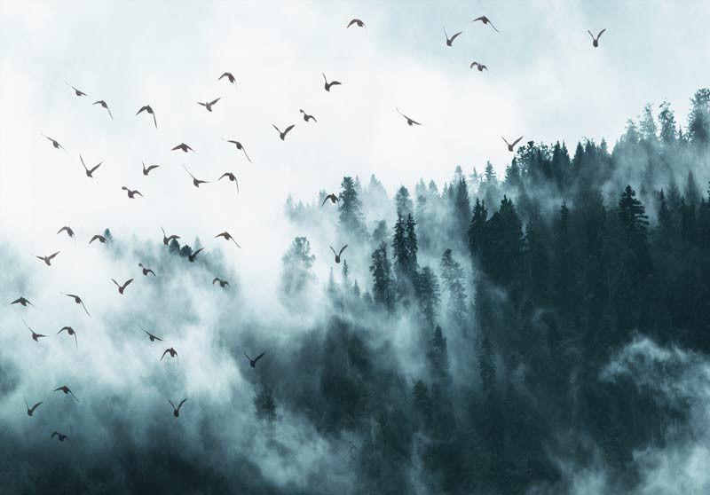 Fotobehang van een schitterend, mistig bos met daarboven allemaal vogels.