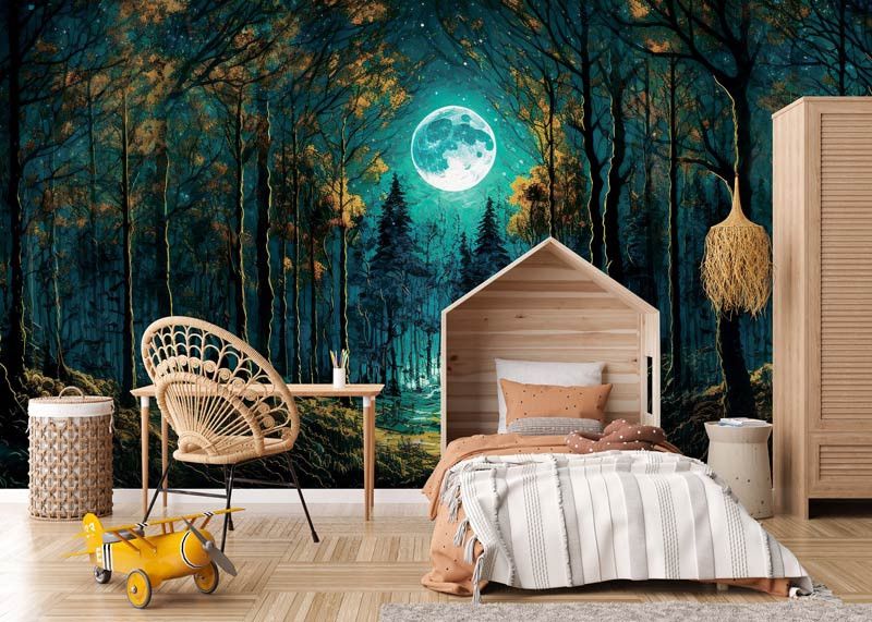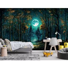Bent u op zoek naar een prachtige toevoeging aan de kinderkamer? Dit schitterende fotobehang van een volle maan in het sprookjesbos tovert de slaapkamer van uw kind om in een magische omgeving vol met betoverende bomen.