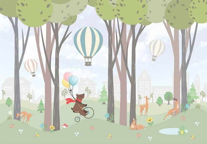 Fotobehang Vrolijke Bosdieren en Luchtballonnen