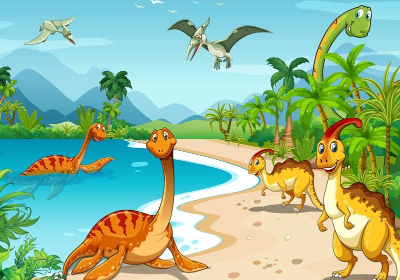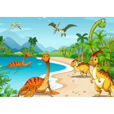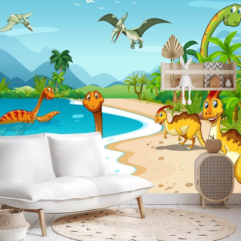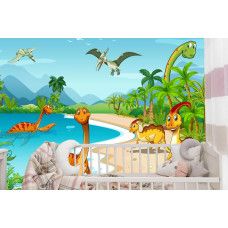 Creëer een speels en levendig decor in de kinderkamer met ons Fotobehang Vrolijke Dinosaurussen. Laat je kinderen kennismaken met een kleurrijke wereld vol prehistorische vreugde en avontuur.