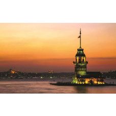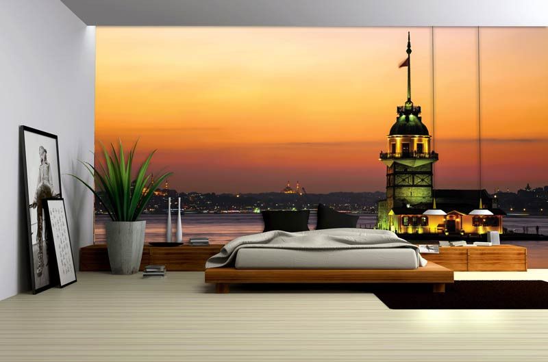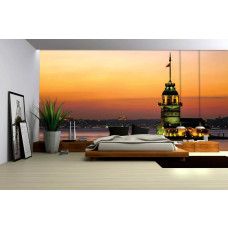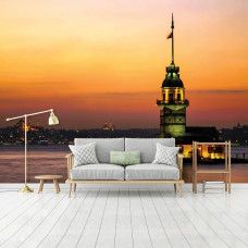 Vlies fotobehang van een prachtige vuurtoren, met op de achtergrond de Turkse wereldstad: Istanboel