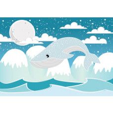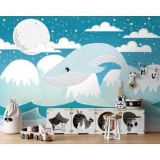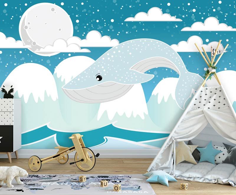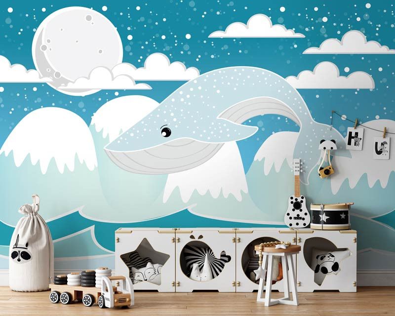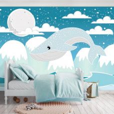 Fotobehang voor de allerkleinsten. Het fotobehang van deze walvis hoog boven het water is een echte eyecatcher voor iedere babykamer of kinderkamer.