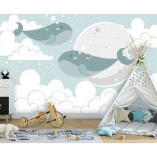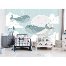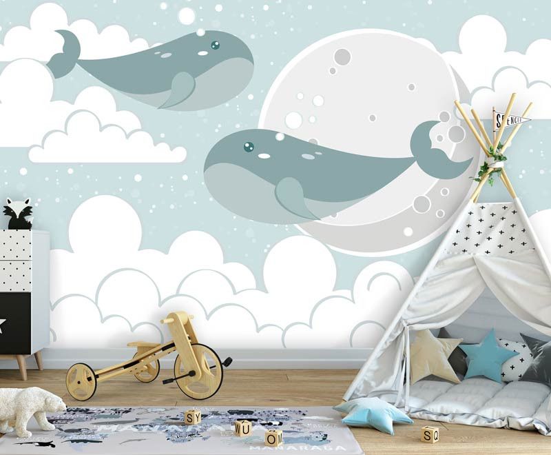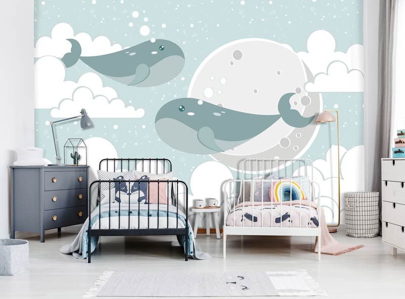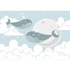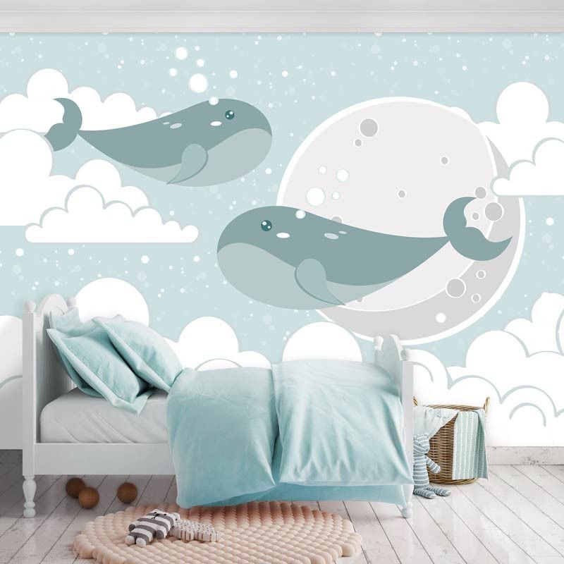 Fotobehang voor de allerkleinsten. Het fotobehang van deze walvissen is een echte eyecatcher in iedere babykamer of kinderkamer.