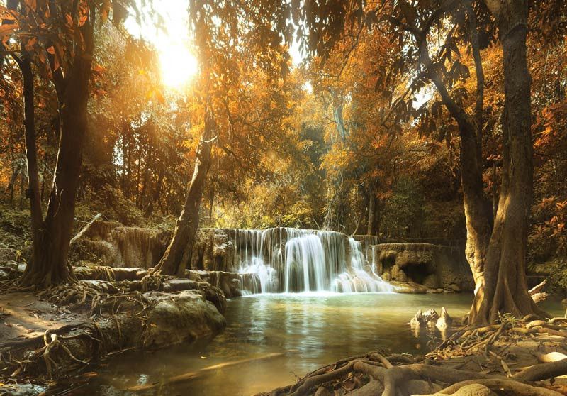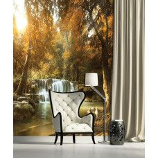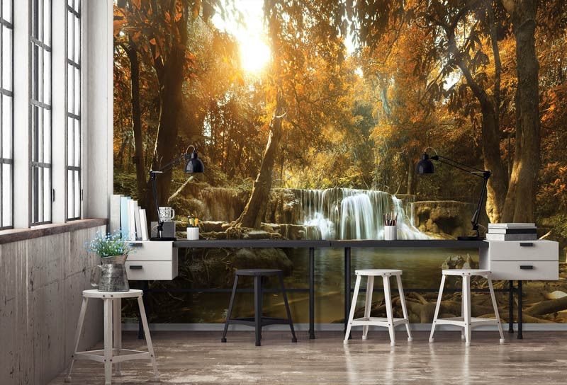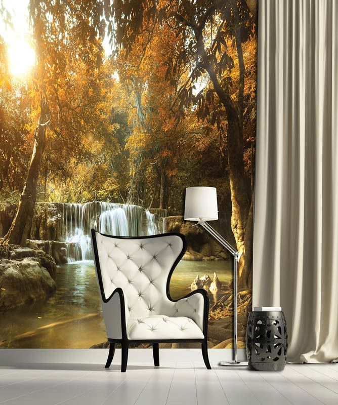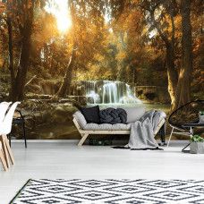 Vliesbehang met daarop een bos met daarin een prachtige waterval en herfstachtige bomen.