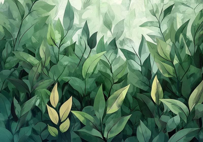 Fotobehang Weelderige Groene Bladeren in Aquarelstijl
