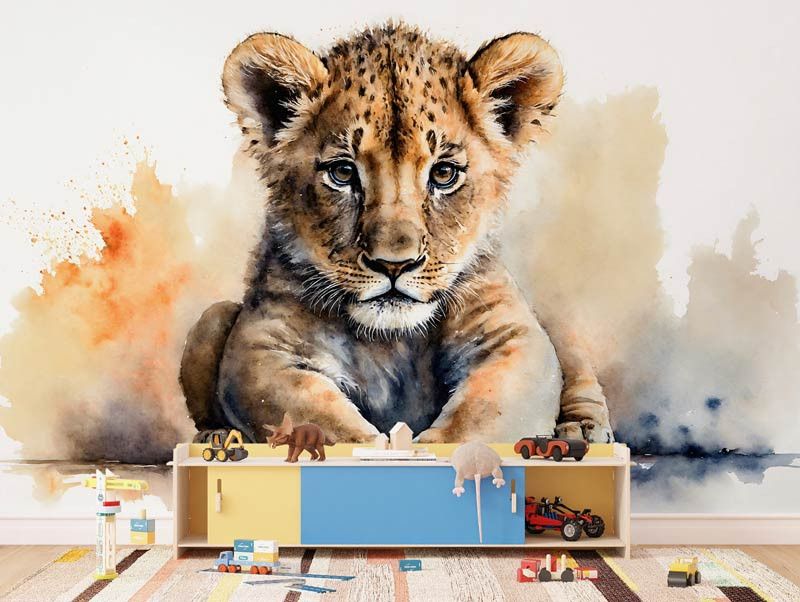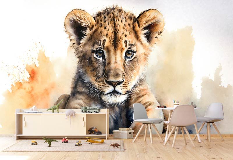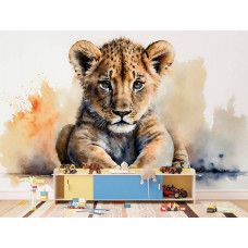 Creëer een speelse en avontuurlijke sfeer in de kinderkamer of babykamer met ons Fotobehang Welp. Dit schattige ontwerp toont een jonge leeuw (welp) met een achtergrond vol prachtige verfkleuren, wat een levendig en artistiek effect geeft. Ideaal voor kinderen die houden van dieren en de magie van de natuur in hun eigen kamer willen beleven.