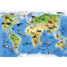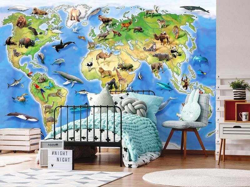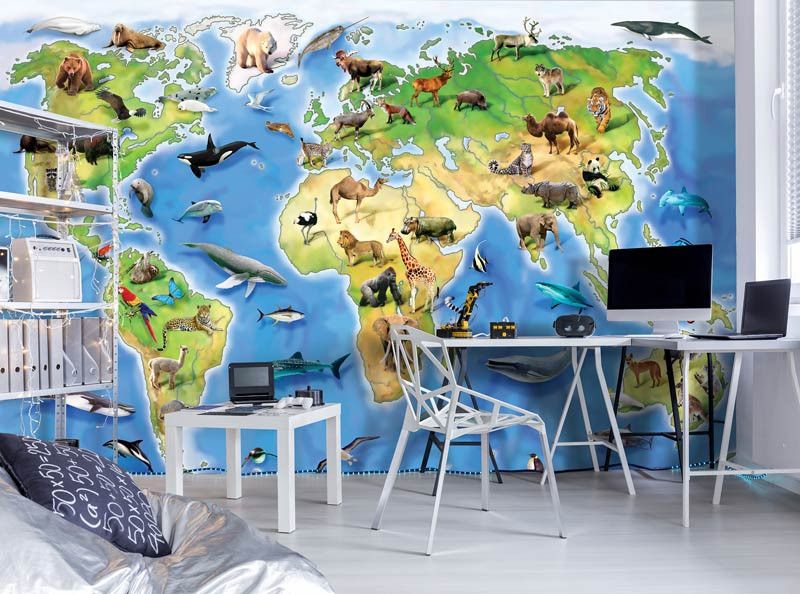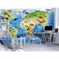 Vlies fotobehang van de wereldkaart en de dieren die daar te vinden zijn. Erg leerzaam voor kinderen.
