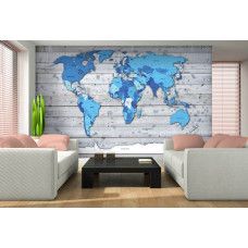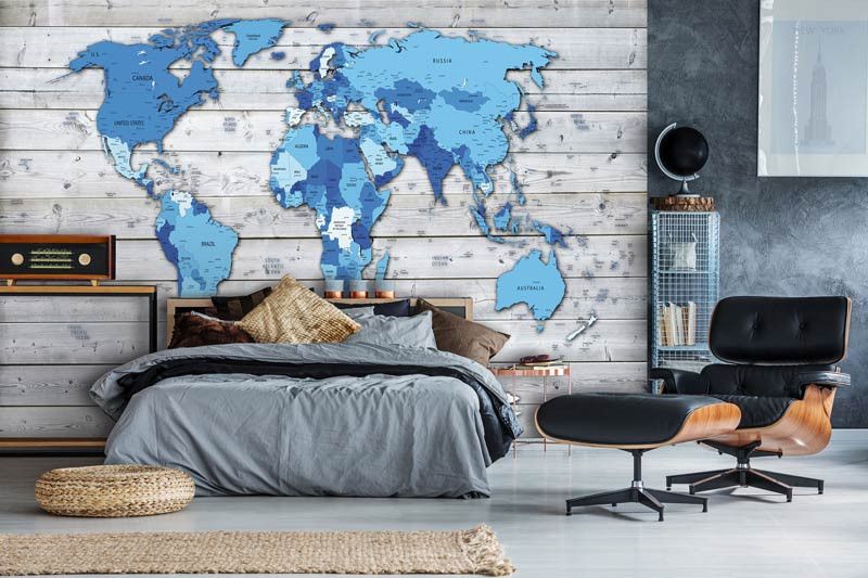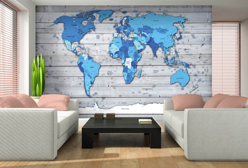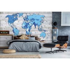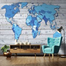 Vlies fotobehang van de blauw gekleurde wereldkaart, weergegeven op houten planken.