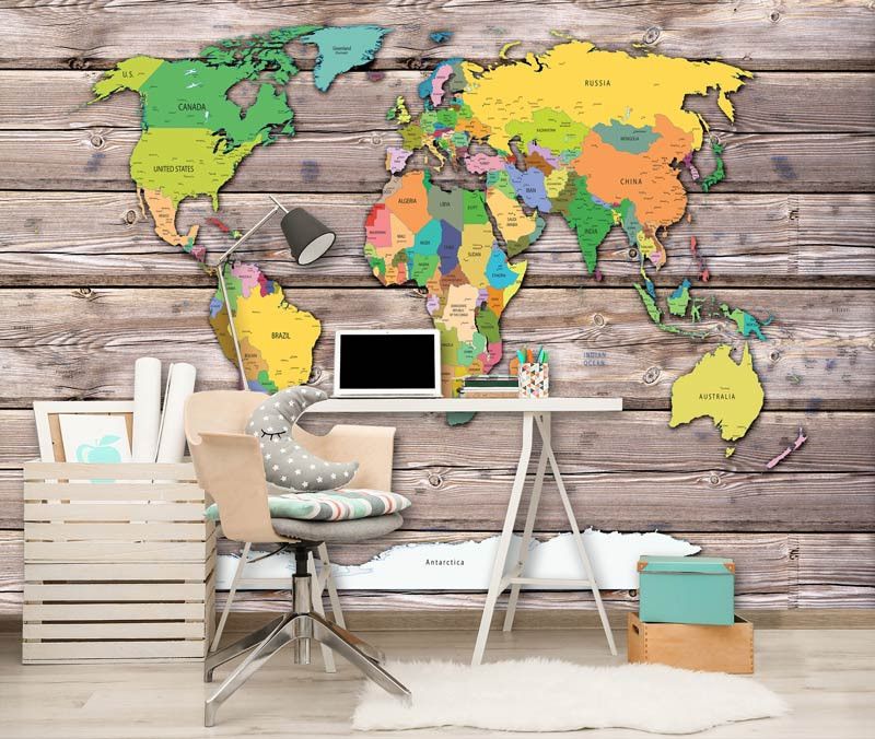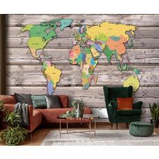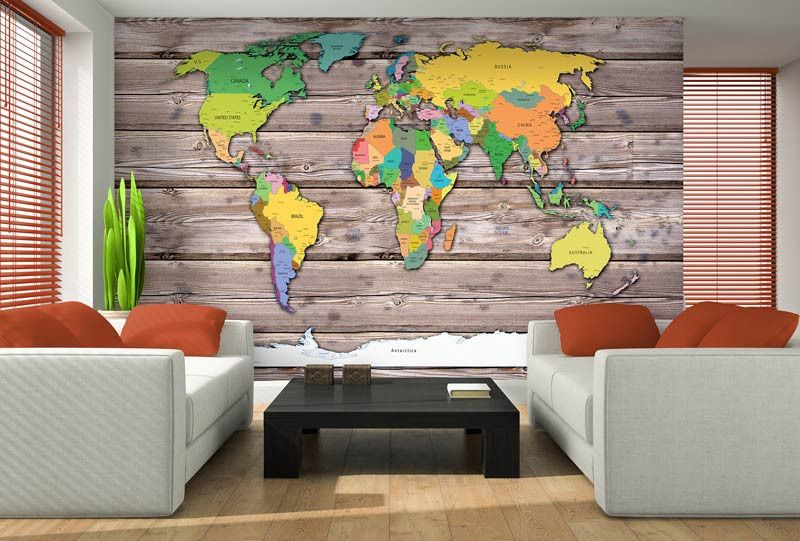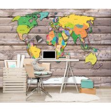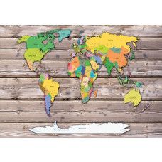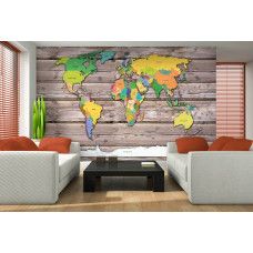 Vlies fotobehang van de gekleurde wereldkaart, weergegeven op houten planken.