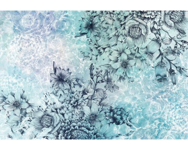 De collage van luchtige bloemenschetsen op zachtblauw zorgen voor een prachtig effect.